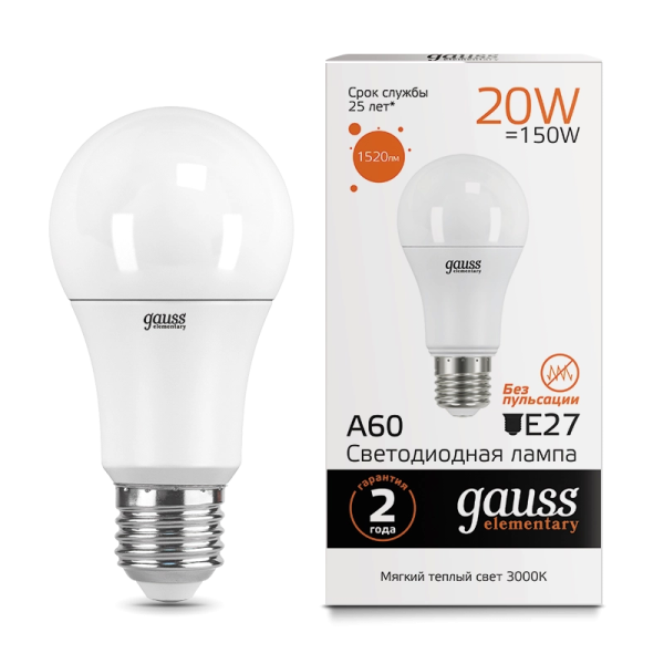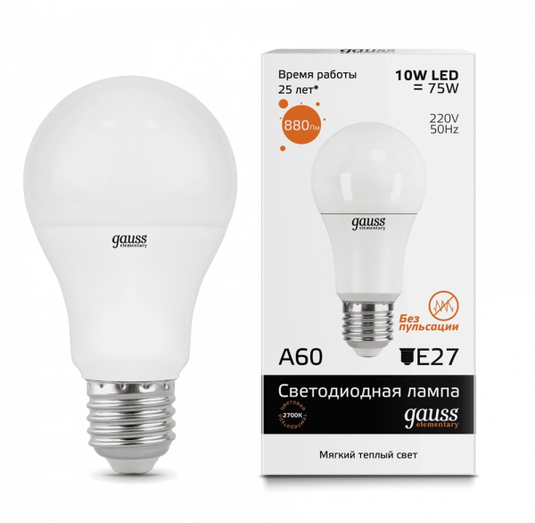 Gauss Elementary A60 10W 880lm 3000K E27 LED 1/10/50 23210 лампа