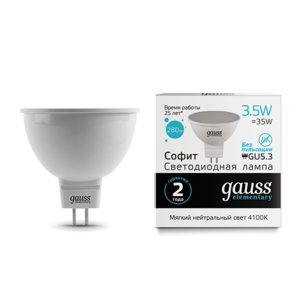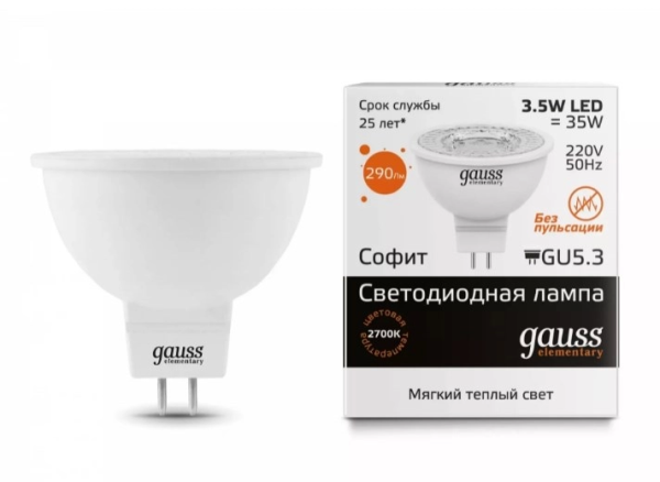 Gauss Elementary MR16 3.5W 290lm 3000K GU5.3 LED 1/10/100 13514 лампа