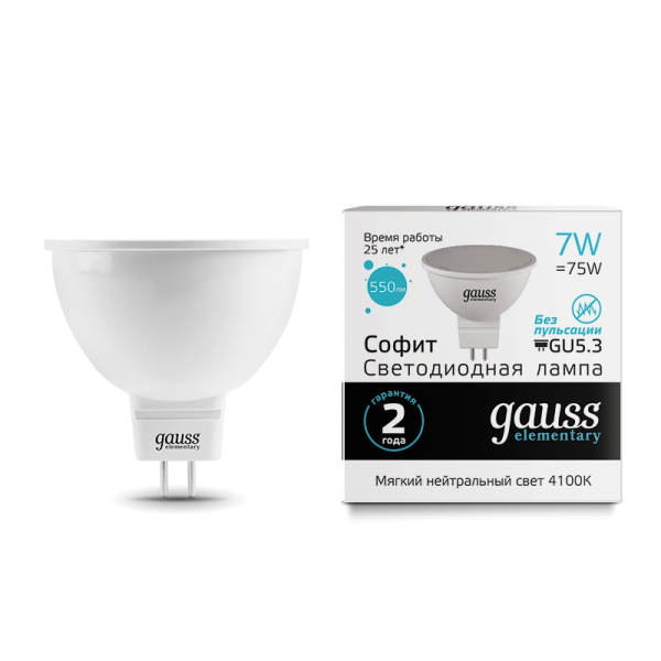 Gauss Elementary MR16 7W 550lm 4100K GU5.3 LED 1/10/100 13527 лампа