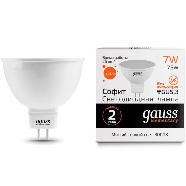 Gauss Elementary MR16 7W 530lm 3000K GU5.3 LED 1/10/100 13517 лампа