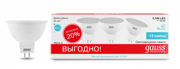 Gauss Elementary MR16 5.5W 450lm 4100 GU5.3 LED 1/10/100 13526 лампа