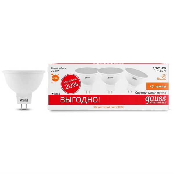 Gauss Elementary MR16 5.5W 430lm 3000 GU5.3 LED 1/10/100 13516 лампа