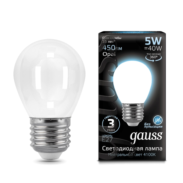 Gauss Filament 5W 450lm 4100 E27 milky LED 1/10/50 105202205 лампа