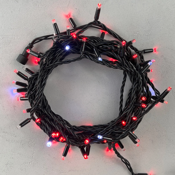 Гирлянда Нить 10м Красная с Мерцанием Белого Диода 24В, 100 LED, Провод Черный ПВХ, IP54